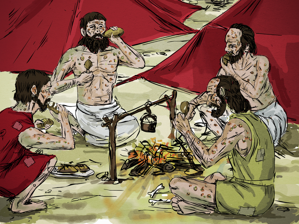 | Meanwhile, there were four lepers who lived at the gates of the city. They decided that they would go into the enemy camp and plead for mercy. |